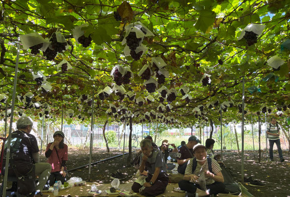 9月23日(祝)かねてから計画していたブドウ狩り。台風14号が接近し当然に雨ですね。朝から雨脚も強まり、”行くん・・” ”どうするん・・?”の不安の声が挙がる中、とりあえず100均でレインコートやらタオル、雑巾などを買い込み強行することに。ハウスの中やんかという情報もあり・・しかし、直前の情報ではハウス内ではなく野ざらし(-_-;)農園でした。それでも、なんと、到着した時心配していた雨はすっかり上がり、心配して待ってくれた園オーナーさん「奇跡や❣」。そんなことで買っていったレインコートを着込んでいざと準備していた皆さんは、レインコートを着たままのぶどう狩りになりました。たわわにみのったぶどう園、2時間食べほうだいでいたが、とても食べきれるものではなく、一房でダウンした人も。せいぜい2房か3房までですね。もう、ぶどうでお腹がいっぱいに。用意したお弁当はつなぐのに戻ってきて食べることになりました。親切で明るいオーナーさんのおかげて、雨上がりの曇天も忘れてわきあいあいのぶどう狩りになりました。「来年もここにくるぞ!」と決意を新たにしたぶどう狩りでした。