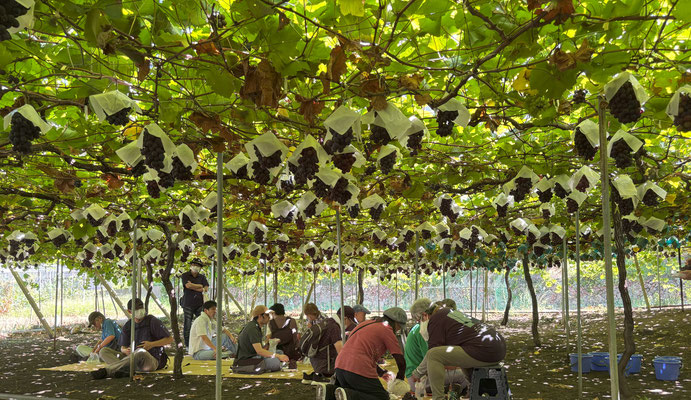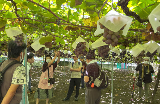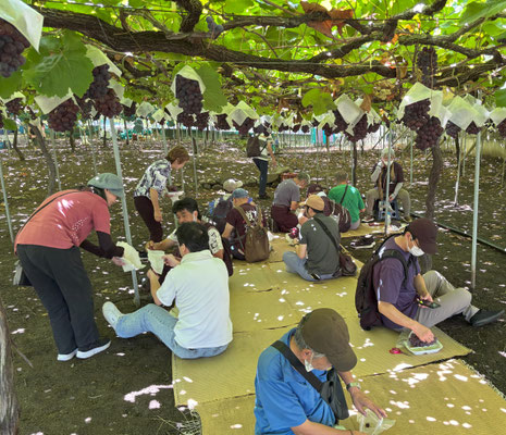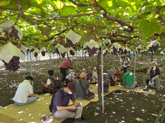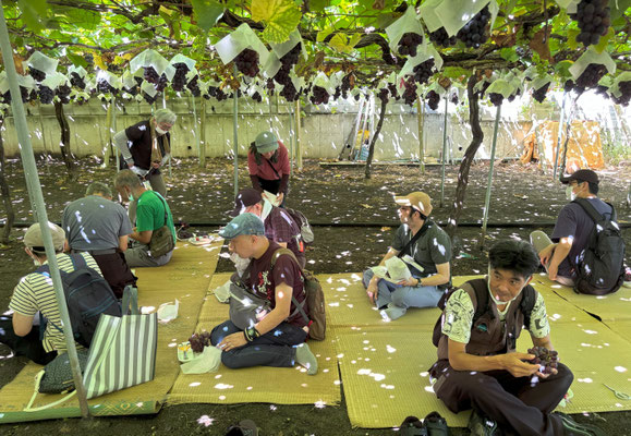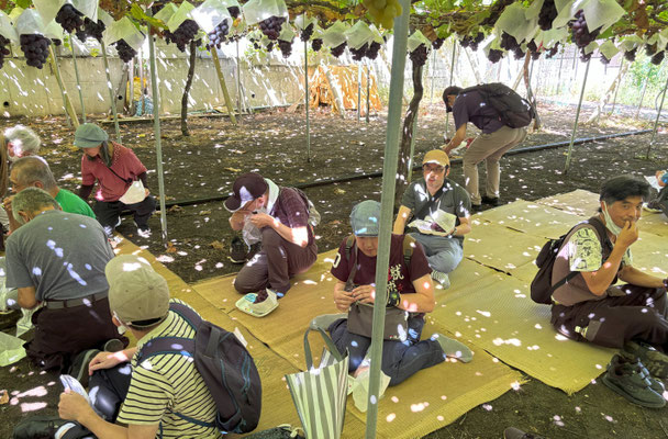今年の猛暑で色づきが遅いというお話でした。色が濃いのを選んで食べてくださいという説明がありました。今年のメンバーさんたち 一房で皆さんお腹いっぱいに。もう食べられへん!という表情の方がほとんどでした。実はみずみずしくて甘くてとてもおいしかったです。お土産を何人もの方が購入しました。写真のシャインマスカットは別注のお土産品です。第2回目は9月15日の予定です。